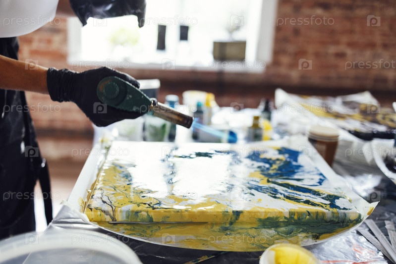 Женщина использует газовую печь для рисования в Fluid Art. Процесс создания картины жидкими акриловыми красками