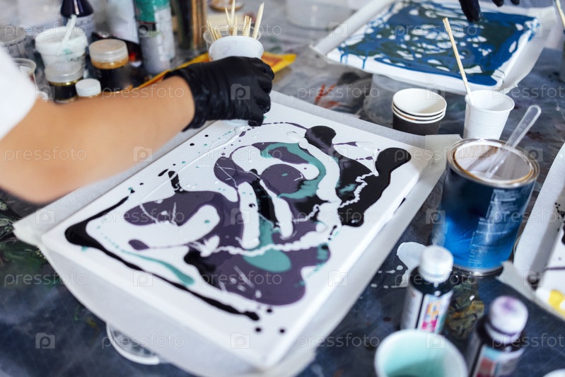 Мастер-класс по заливке акриловой жидкостью. Молодые женщины рисуют жидким акрилом в художественной мастерской