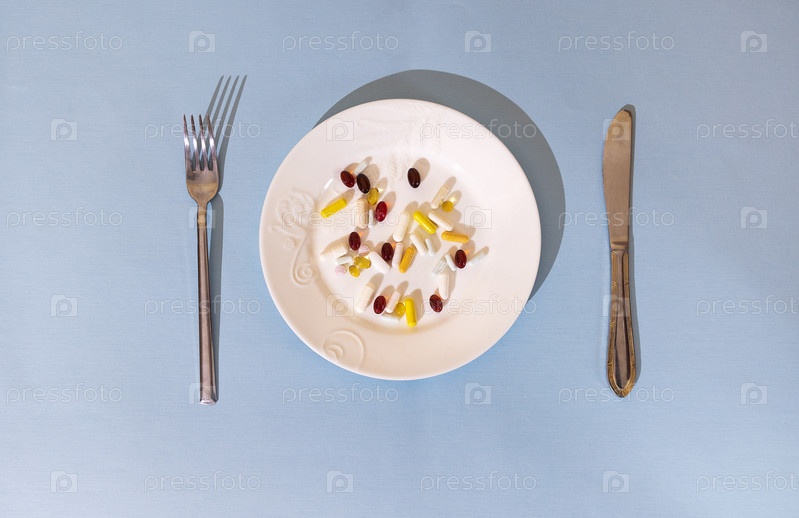 Таблетки, пилюли и капсулы на белой фарфоровой тарелке. Стол накрыт тарелкой
