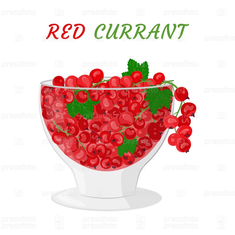 Ягоды красной смородины с зелеными листьями в стеклянной таре. Концепция здорового питания. Спелые ягоды. Сбор фруктов. Векторная иллюстрация в плоском стиле