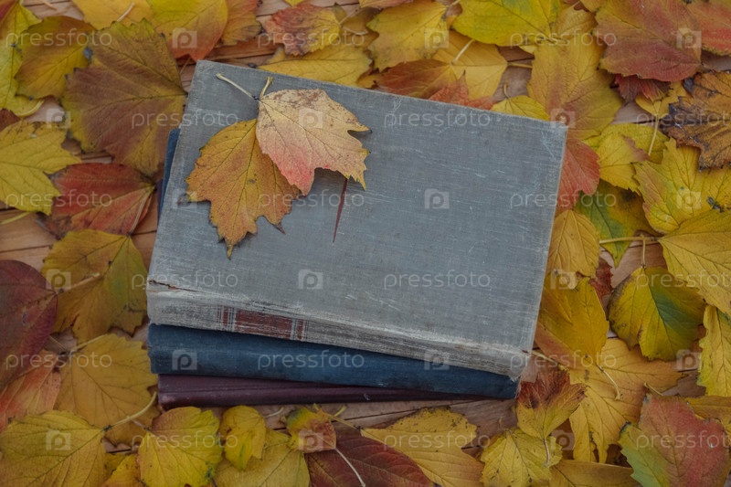 Стопка старых, старинных книг на деревянном столе в парке, усыпанная желтыми, зелеными, красными, оранжевыми, осенними, кленовыми листьями, вид сверху