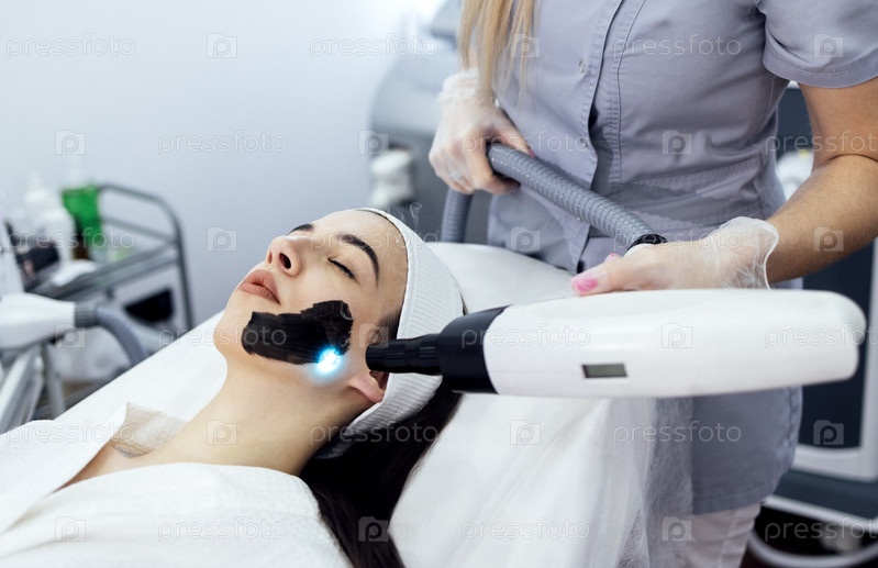 Косметолог держит лазер красоты рядом с лицом женщины, покрытым угольной маской