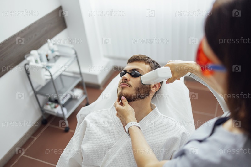 Молодой человек получает фотоэпиляцию во время посещения салона красоты в салоне