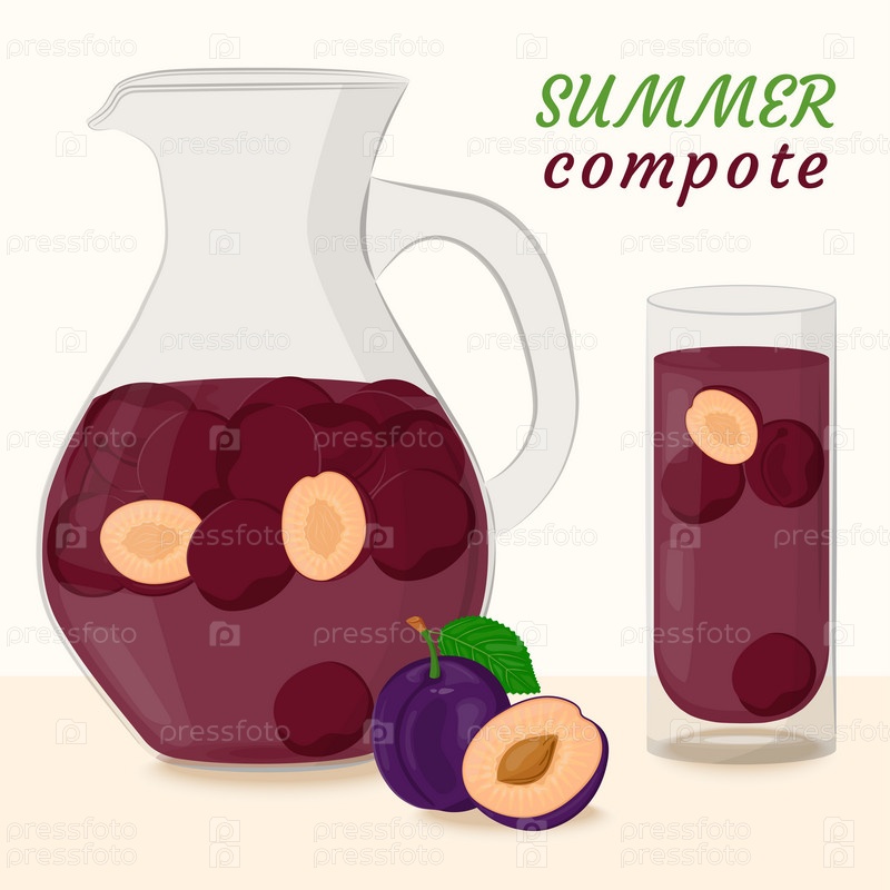 Сливовый компот в стеклянном графине и стакане. Питье из домашних фруктов. Ягоды для здорового летнего напитка. Концепция здорового питания. Векторная иллюстрация в плоском стиле