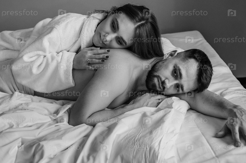 Счастливая молодая пара сидит утром в постели и завтракает в отеле