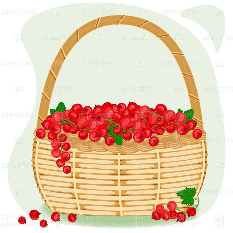 Ягоды красной смородины с зелеными листьями в плетеной корзине. Концепция здорового питания. Спелые ягоды. Сбор фруктов. Векторная иллюстрация в плоском стиле
