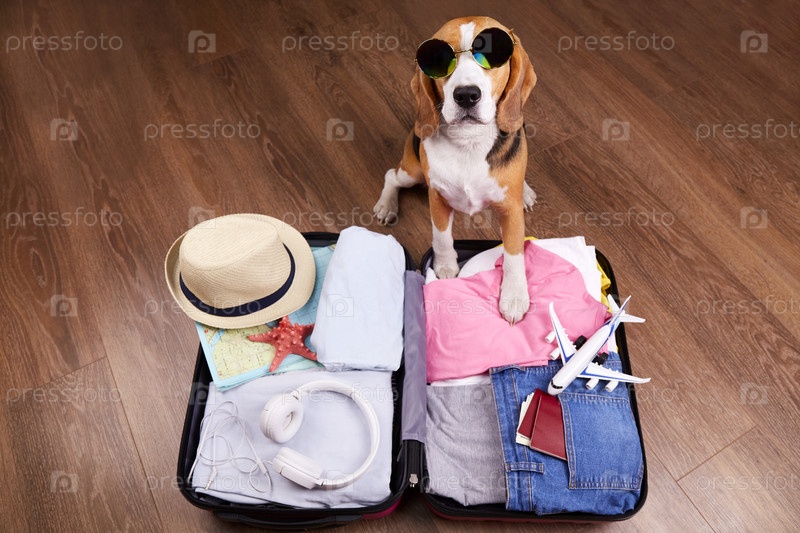 Бигль в соломенной шляпе у чемодана