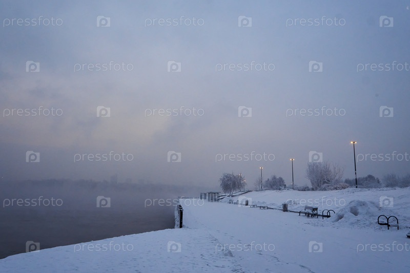 Морозное туманное зимнее утро над Енисеем в центре Красноярска