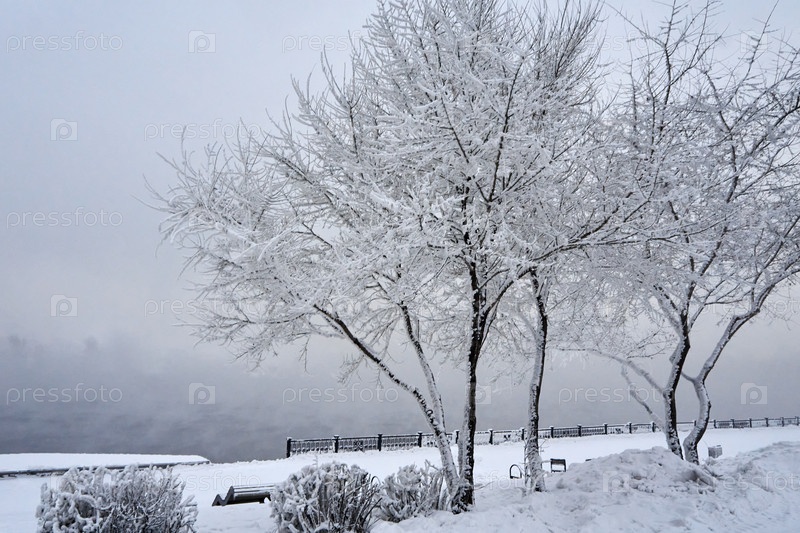 Морозное туманное зимнее утро над Енисеем в центре Красноярска