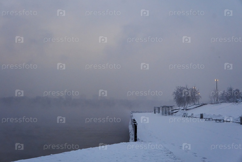 Морозное туманное зимнее утро над Енисеем в центре Красноярска
