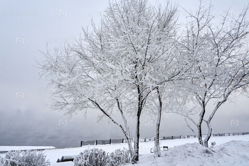 Морозное туманное зимнее утро над Енисеем в центре Красноярска