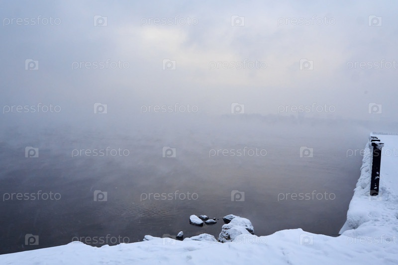 Морозное туманное зимнее утро над Енисеем в центре Красноярска