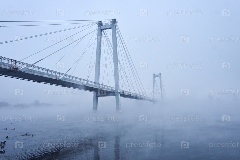 Морозное туманное зимнее утро над Енисеем в центре Красноярска
