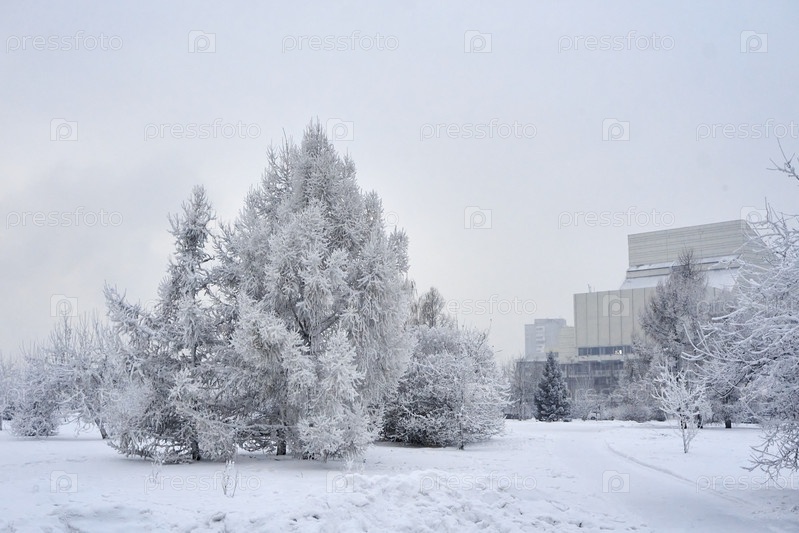 Морозное туманное зимнее утро над Енисеем в центре Красноярска