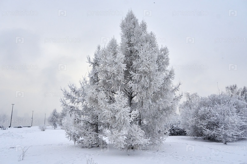 Морозное туманное зимнее утро над Енисеем в центре Красноярска