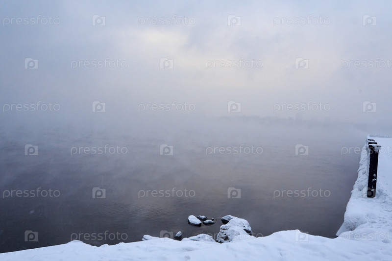 Морозное туманное зимнее утро над Енисеем в центре Красноярска