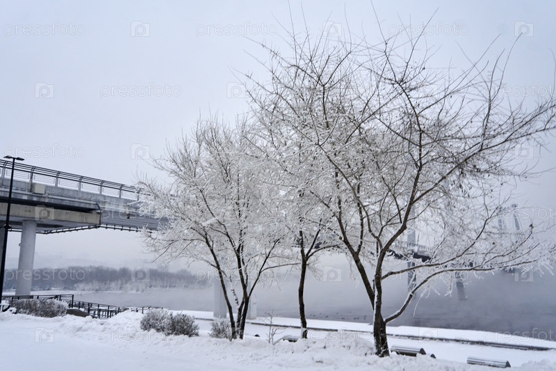 Морозное туманное зимнее утро над Енисеем в центре Красноярска