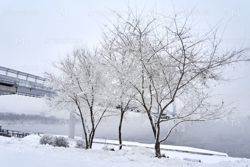 Морозное туманное зимнее утро над Енисеем в центре Красноярска