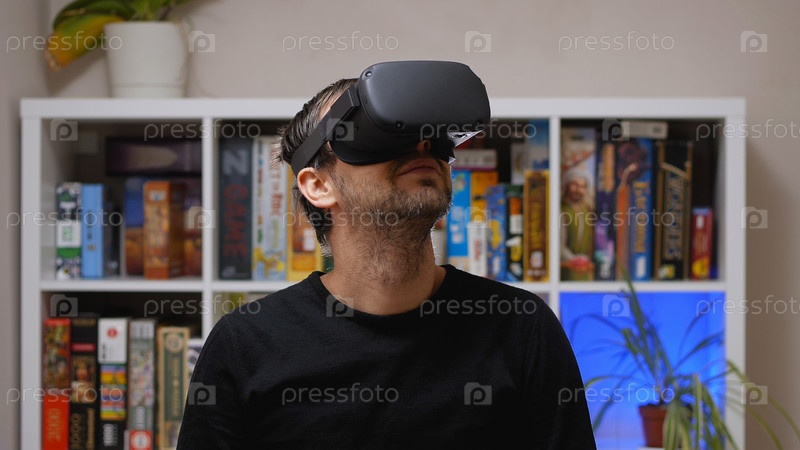 Крупный план белого мужчины в черном шлем с капюшоном и очками виртуальной реальности на голове. Домашний интерьер. VR-шлем для развлечений, обучения и игр