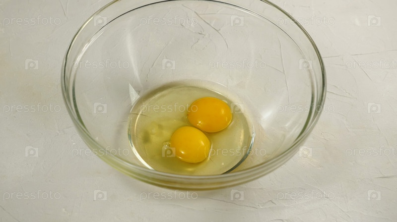Крупный план двух разбитых куриных яиц в стеклянной чашке. Концепция домашней выпечки. Торт своими руками