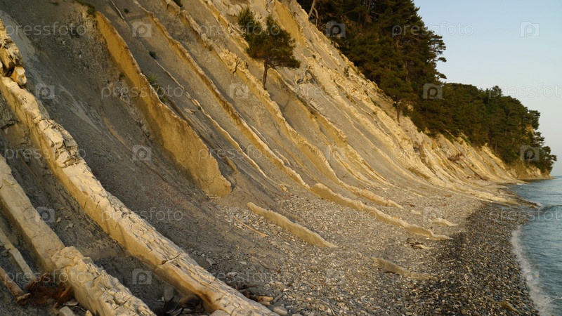 Морской скалистый берег с соснами на вершине. Красивый дикий берег моря со скалами и соснами. Путешествие по удивительным местам планеты
