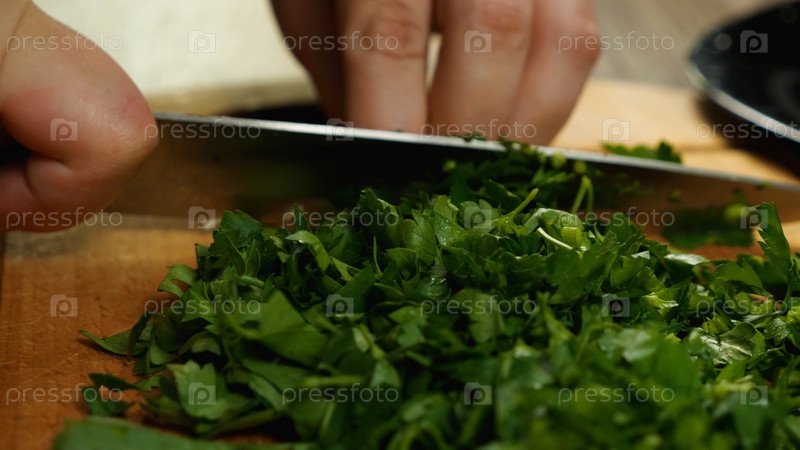 Крупный план повара, нарезающего петрушку ножом на разделочной доске. Вид сбоку. Вкусная и здоровая еда