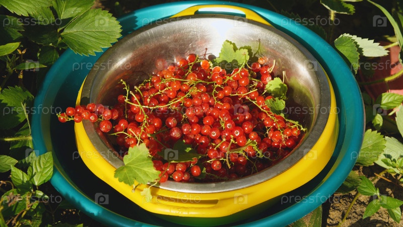 Красную смородину собирают в металлическую чашку. Сбор летних культур в саду. Крупный план