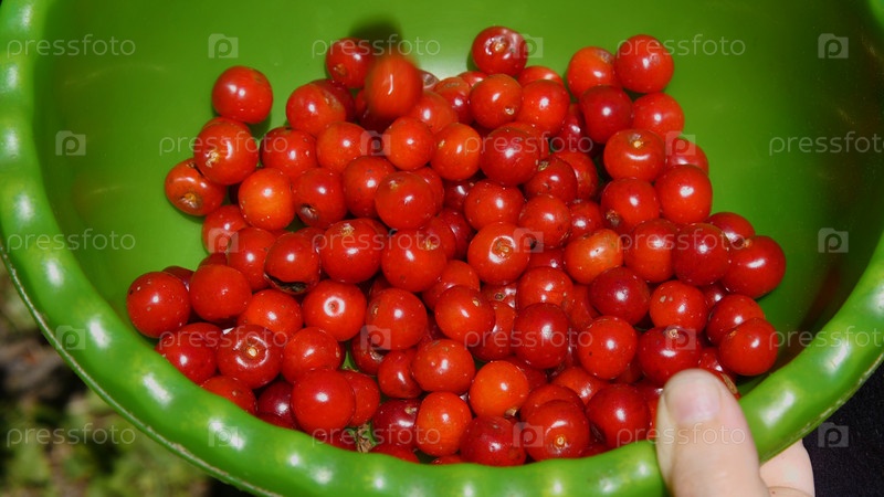 Крупный план сбора спелых красных вишен в зеленой пластиковой миске. Сбор урожая в саду в начале лета