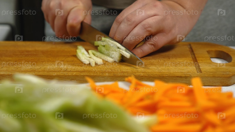 Шеф-повар нарезает зеленый редис соломкой. Передний план. Крупный план. На переднем плане тарелка с нарезанными овощами. Вегетарианская еда