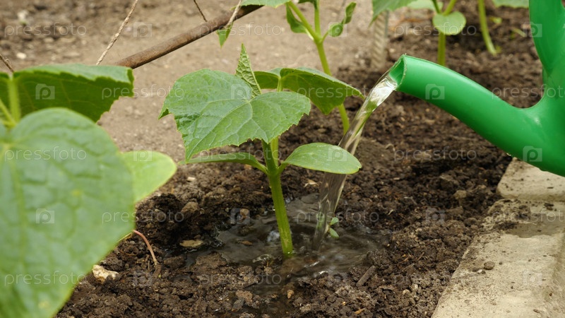 Лейка поливает молодую рассаду огурцов. Выращивание овощей в домашней теплице во время продовольственного кризиса