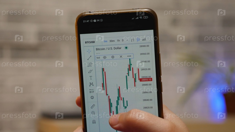 На экране смартфона - график стоимости криптовалюты биткоин в долларах США.На заднем плане яркая каменная стена.График BTC на экране