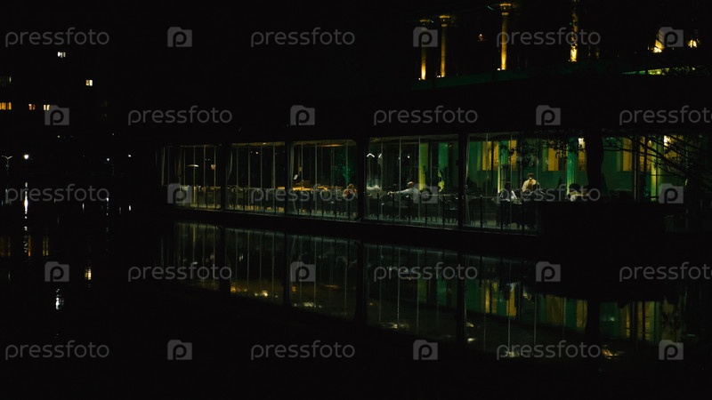 Кафе возле набережной ночью. Красивое отражение зеленых огней на поверхности воды. В кафе обедает несколько человек, работает официант