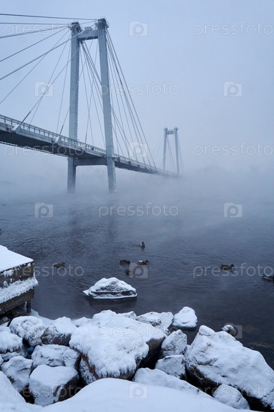 Морозное туманное зимнее утро над Енисеем в центре Красноярска