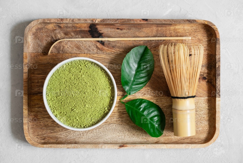 Набор зеленого чая маття в деревянном подносе. Порошок матча, бамбуковый венчик и листья. Органический веганский напиток. Традиционный японский чай. Вид сверху, плоская планировка