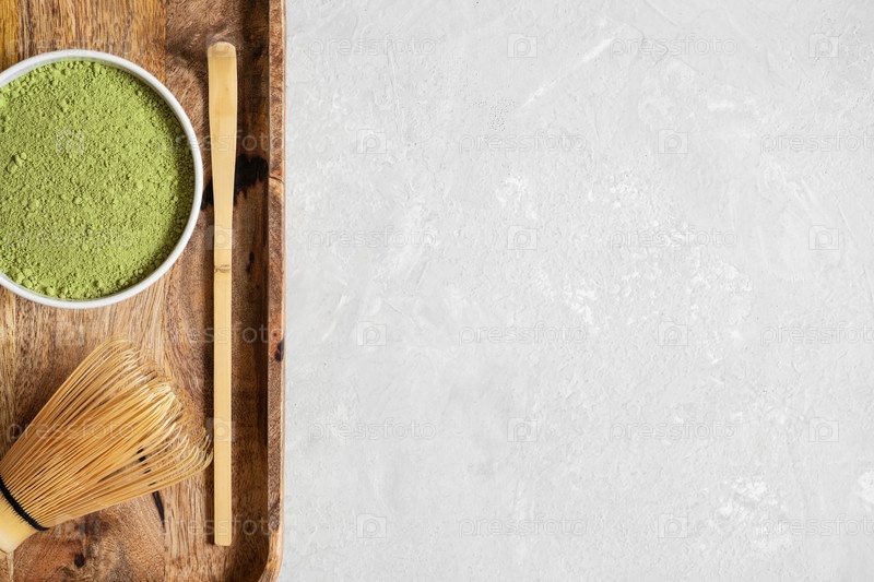 Порошок зеленого чая матча и бамбуковые аксессуары для чайной церемонии в деревянном подносе. Концепция здорового напитка. Вид сверху. Скопируйте пространство