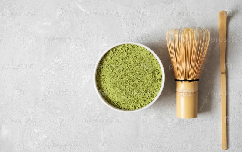 Набор зеленого чая маття. Порошок маття и бамбуковые аксессуары для чайной церемонии на сером фоне. Скопируйте пространство, вид сверху, плоская планировка