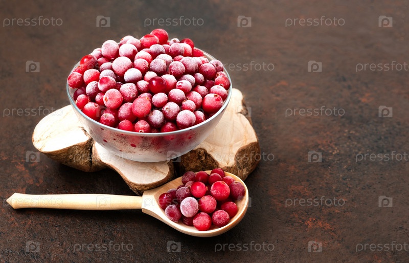 Замороженная клюква в миске крупным планом. Замороженные ягоды с деревянной ложкой на коричневом фоне. Скопируйте пространство