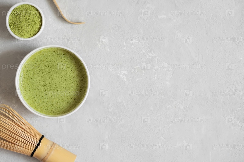 Чай маття на сером фоне. Традиционный японский зеленый чай. Органический здоровый травяной напиток. Скопируйте пространство, вид сверху, плоская планировка