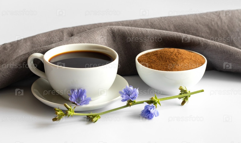 Чашка с напитком из цикория, порошком и синими цветами на белом фоне. Полезный заменитель кофе