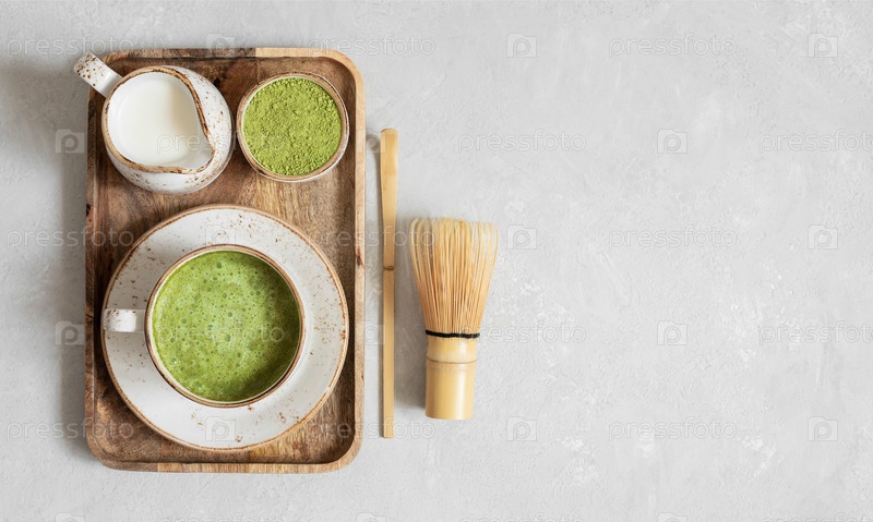 Латте с чаем матча с молоком, порошок матча в деревянном подносе на сером бетонном фоне. Скопируйте пространство, вид сверху, плоская планировка