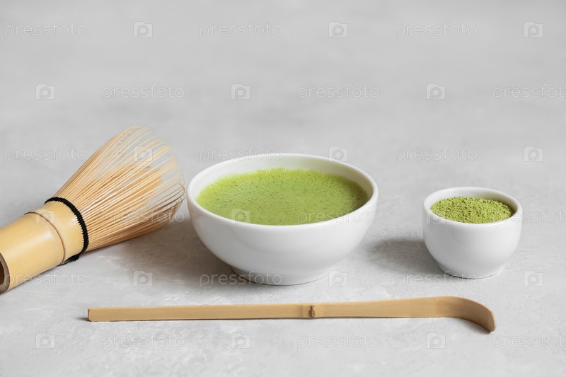 Зеленый чай маття. Набор для японской чайной церемонии на фоне серого бетона. Место для текста
