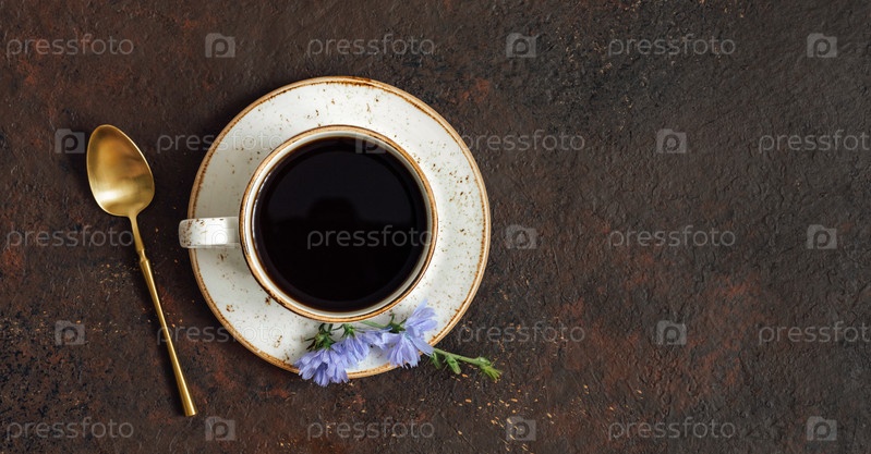 Напиток из цикория, ложка золотого цвета и цветок цикория на темно-коричневом фоне. Травяной здоровый заменитель кофе. Вид сверху