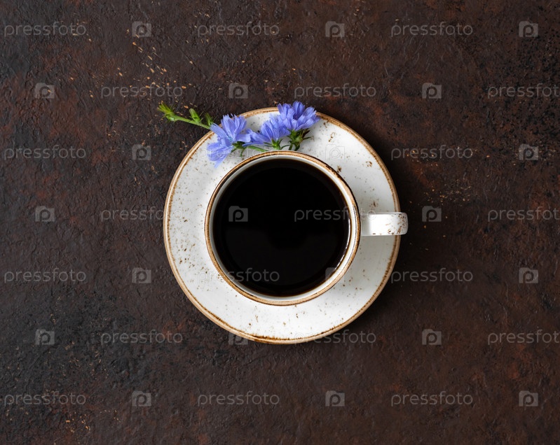 Напиток из цикория в белой чашке и синий цветок на коричневом фоне. Натуральная альтернатива кофе. Без кофеина. Вид сверху, плоская планировка