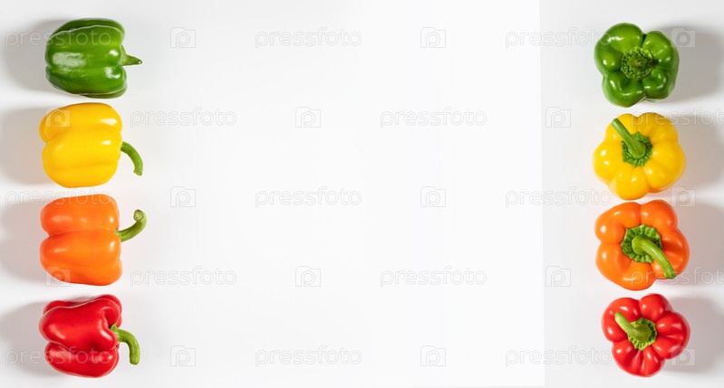 Цветные болгарские перцы на белом фоне. Зеленый, желтый, оранжевый и красный перец. Концепция еды