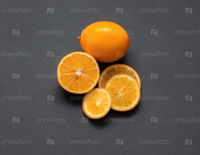 Нарезанные цитрусовые на каменном столе. Продовольственный фон. Плоская укладка. Сочные спелые ломтики апельсинового лимона, цитрусовые мейери на сером фоне. Вид сверху крупным планом