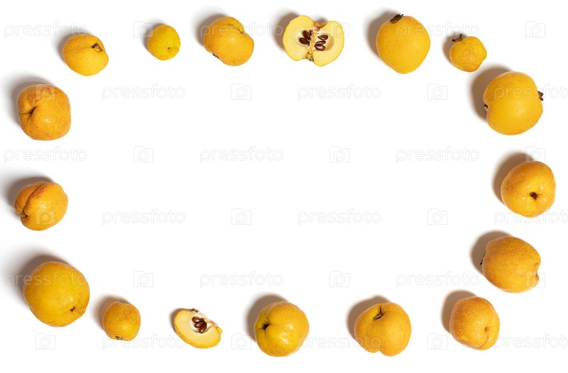 Кадр из айвы изолирован на белом фоне. Желтая спелая айва. Свежие сочные фрукты. Скопируйте пространство. Вид сверху, плоская планировка
