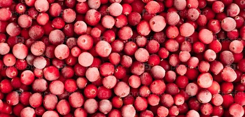 Замороженный фон клюквы крупным планом. Красная ягода. Клюква с морозом. Вид сверху