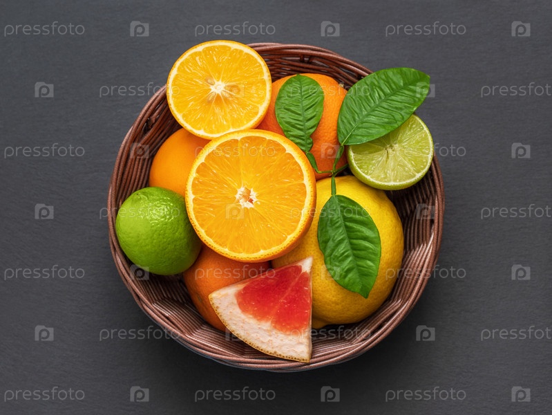 Нарезанные цитрусовые в корзине на каменном столе. Плоская укладка. Сочные спелые ломтики апельсина, лимона, грейпфрута и лайма на черном фоне. Фруктовая смесь, вид сверху крупным планом