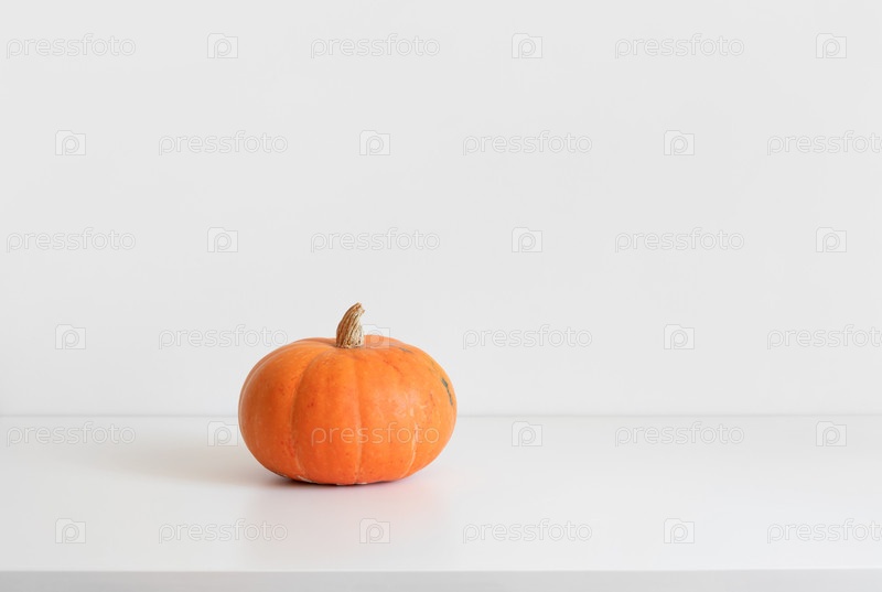 Маленькая тыква на белом фоне с копией пространства. День благодарения или осенняя минимальная концепция. Спелая оранжевая тыква