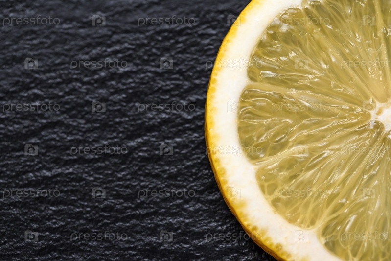Нарезанный желтый лимон на черном фоне крупным планом. Продовольственный фон. Плоская укладка. Сочный спелый свежий цитрусовый лимон. Вид сверху, макро